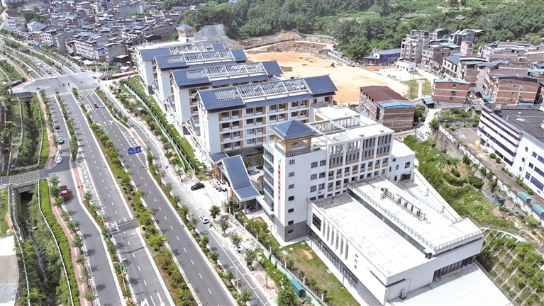 寧德市民族中學新校區(qū)項目規(guī)劃總建筑面積77429.55平方米,校園建設用地78188.67平方米。校區(qū)采用南北分區(qū)設計,按省示范性高中標準建設,辦學規(guī)模為36個教學班,可容納1800名在校生實行全寄宿制管理。其中,南區(qū)定位為教學與運動區(qū),建有3棟教學樓、1棟實驗綜合樓以及1棟集辦公與圖書館功能于一體的綜合樓;北區(qū)則規(guī)劃為民族文化傳承中心與生活區(qū)。目前,該項目建設已進入尾聲,計劃于今年9月正式啟用。