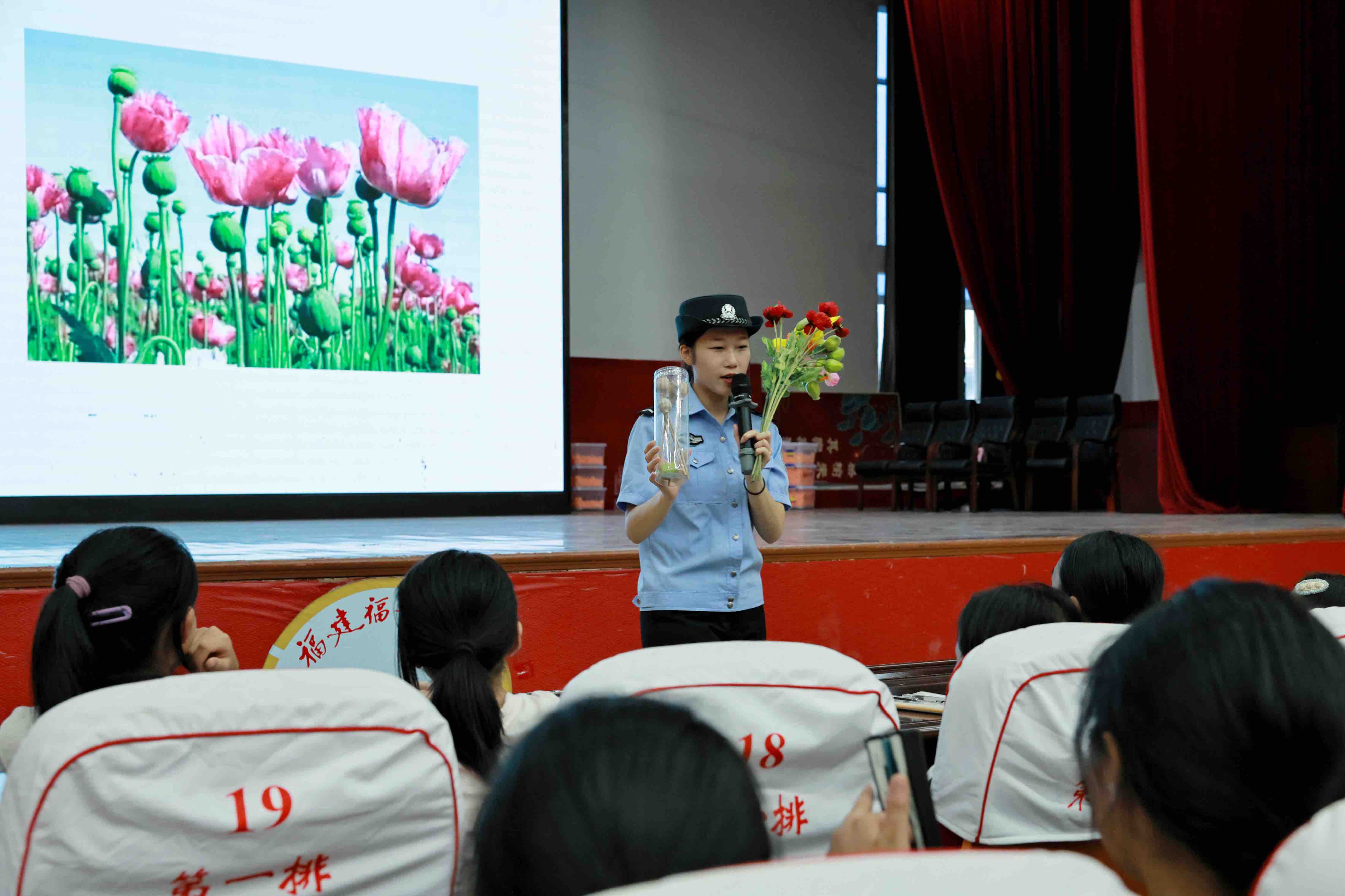禁毒大隊推出的“藍光普法小劇場”成為亮點。學(xué)生們參與演繹情景劇《新型毒品的偽裝套路》,真實還原不法分子誘騙青少年飲用含毒飲料的場景,生動揭示新型毒品的隱蔽性與危害性。宣講員還系統(tǒng)講解“開心水”“笑氣”“依托咪酯電子煙”等未列管成癮物質(zhì)的嚴重危害,警示學(xué)生保持警惕、遠離毒品陷阱。