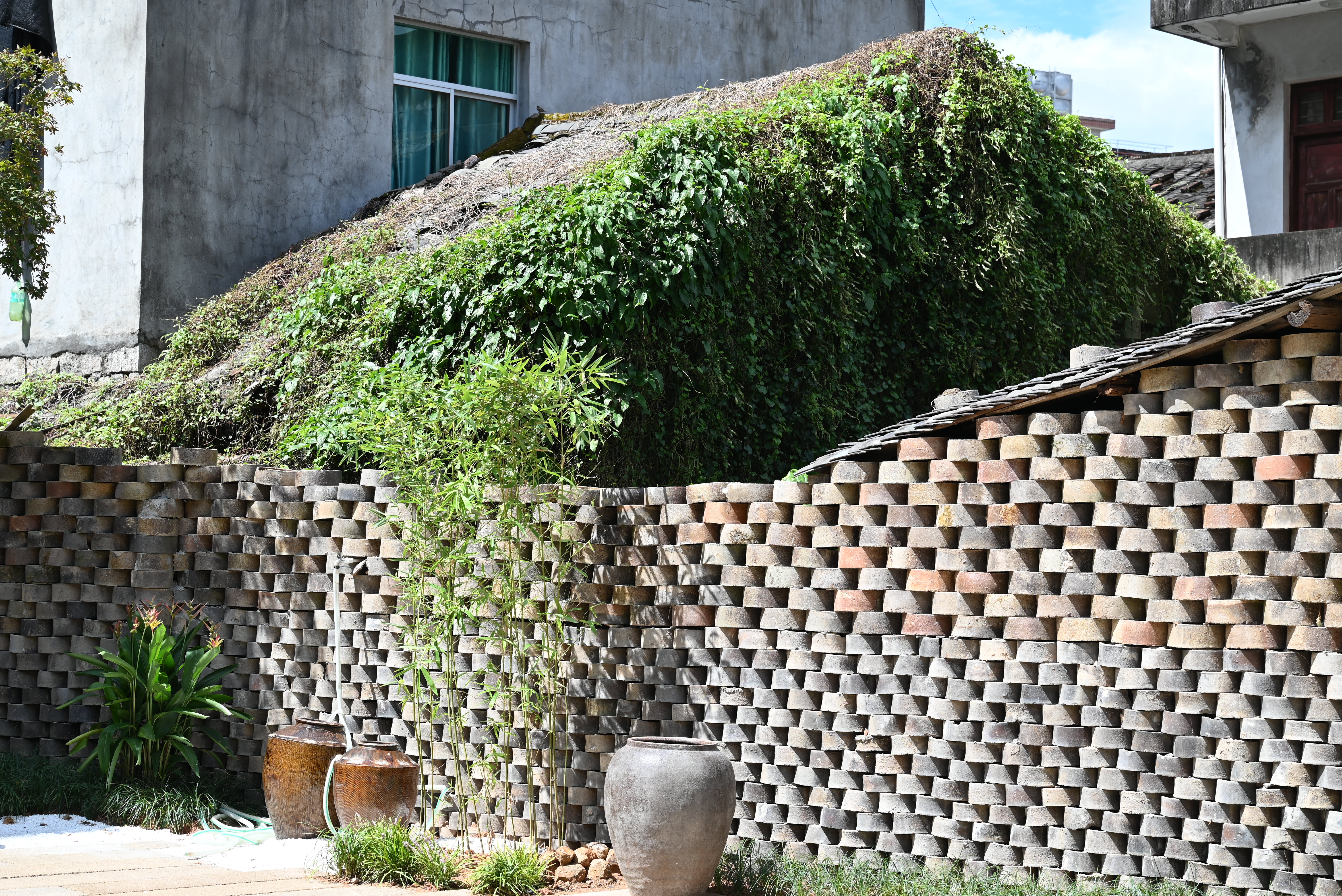 “第一次見用這種‘圓罐子’砌墻的房子,遠看像藝術品,近摸還很結實。” 前來游玩的游客李女士指著匣缽屋外墻感嘆。記者注意到,這些民房外墻由一個個鏤空圓柱體交叉堆疊而成,連接處僅用少量泥土粘合,整體呈現(xiàn)出獨特的編織紋理。?