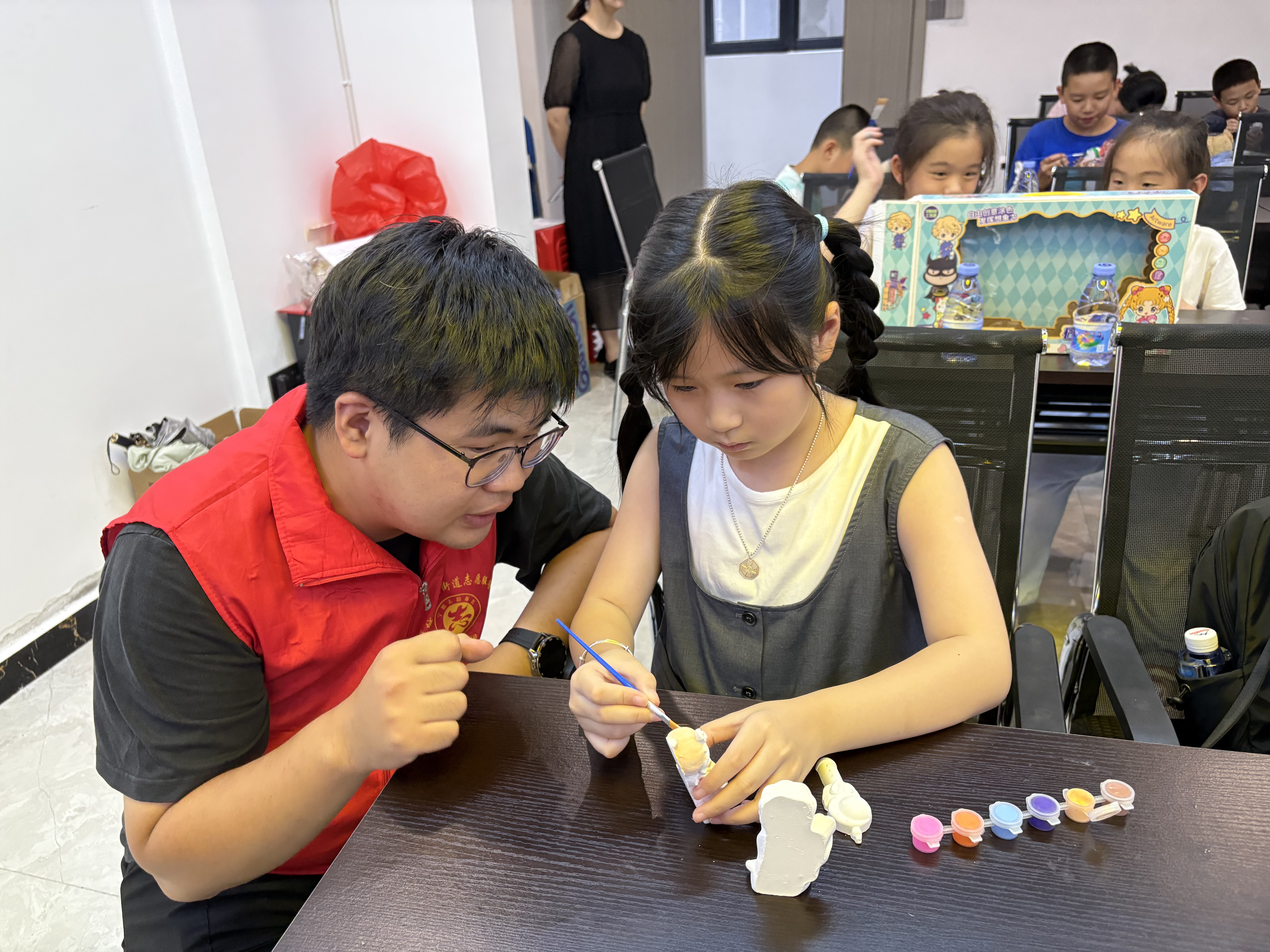 “大家可以先想想自己想給石膏涂什么顏色,比如給小公主的裙子涂粉色,給魔法棒涂上紅色和黃色,涂的時(shí)候要順著一個(gè)方向,這樣顏色會(huì)更均勻哦!” 課堂現(xiàn)場(chǎng),社區(qū)志愿者拿起示范石膏,耐心講解色彩搭配原理和涂色技巧。孩子們聽(tīng)得格外認(rèn)真,有的低頭琢磨自己的創(chuàng)作思路,有的和身邊小伙伴小聲討論,還有的已經(jīng)迫不及待地蘸取顏料,在調(diào)色盤里調(diào)試心儀的顏色。一筆一畫間,原本潔白的石膏模型漸漸被賦予獨(dú)特個(gè)性。