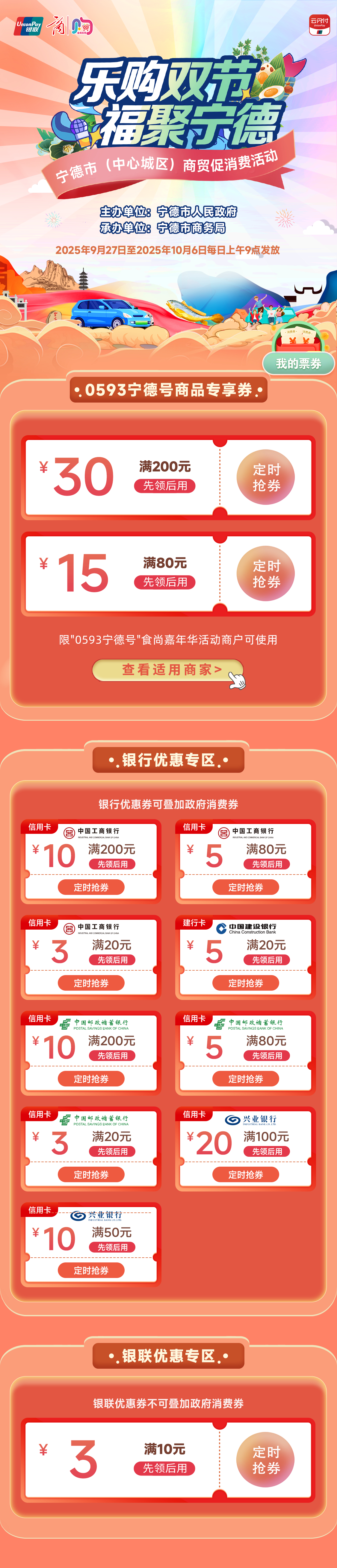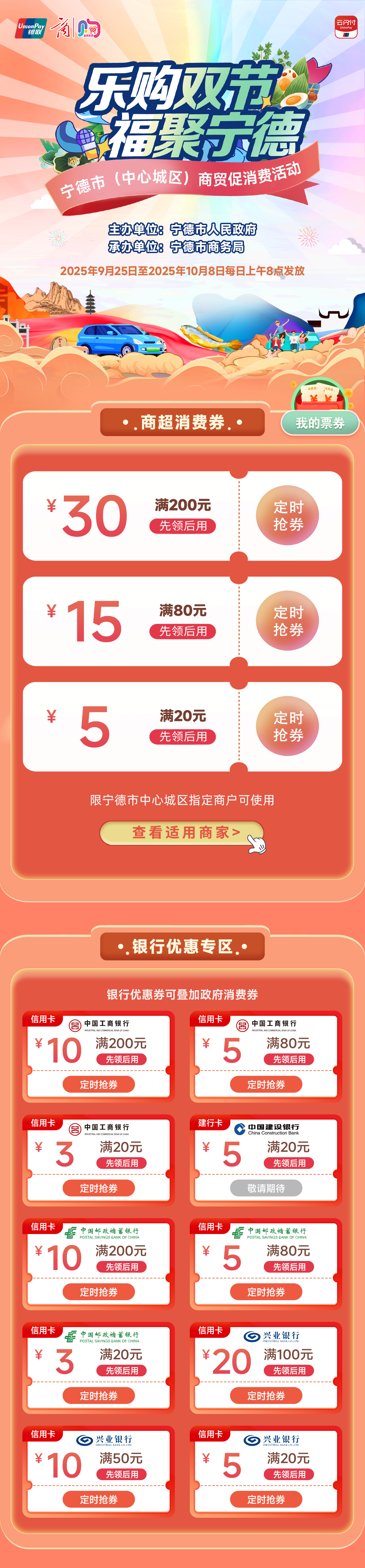 本次活動時間從2025年9月25日至10月8日,共計(jì)14天。中心城區(qū)(蕉城、東僑)市民和游客均可領(lǐng)取,數(shù)量有限,先到先得。用戶通過云閃付APP,訪問“政府消費(fèi)券”專區(qū),進(jìn)入“樂購雙節(jié)·福聚寧德”頁面領(lǐng)券;領(lǐng)取成功后,到指定活動商家使用云閃付APP或手機(jī)銀行APP(云網(wǎng)版)支付立享優(yōu)惠;活動專區(qū)可查看消費(fèi)券的使用進(jìn)度和適用商家。