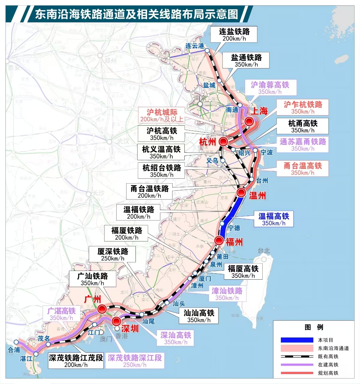 新建溫福高鐵與已開通的福州至廈門高鐵、廣州至汕尾高鐵、汕頭至汕尾高鐵,正在建設(shè)的漳州至汕頭高鐵,規(guī)劃的寧波至溫州高鐵,將組成新的更高標(biāo)準(zhǔn)的寧波至廣州高鐵通道,路網(wǎng)地位十分重要。項(xiàng)目建成后,將與2013年全線貫通運(yùn)營的既有杭州至深圳高鐵,形成聯(lián)通溫州與福州的高鐵雙通道,進(jìn)一步壓縮東南沿海城市間時空距離,密切長三角與粵港澳大灣區(qū)的聯(lián)系,極大便利沿線人民群眾出行,對于加快推動長三角地區(qū)一體化發(fā)展和“海絲”核心區(qū)建設(shè),具有十分重要的意義。