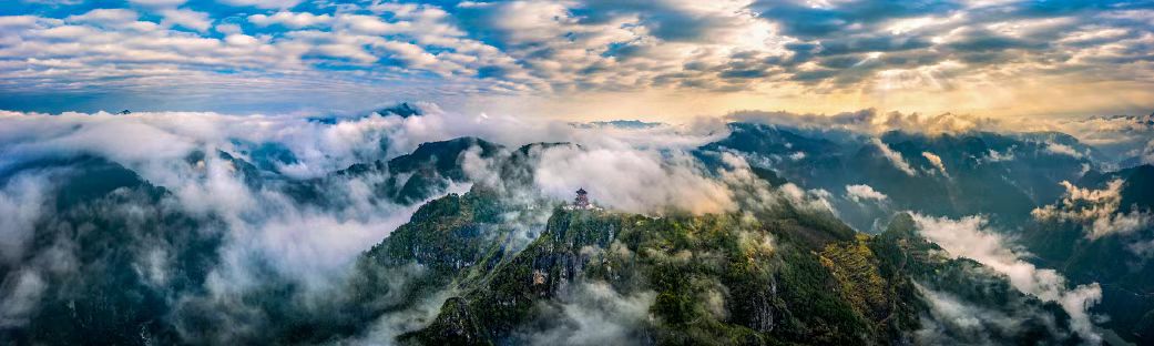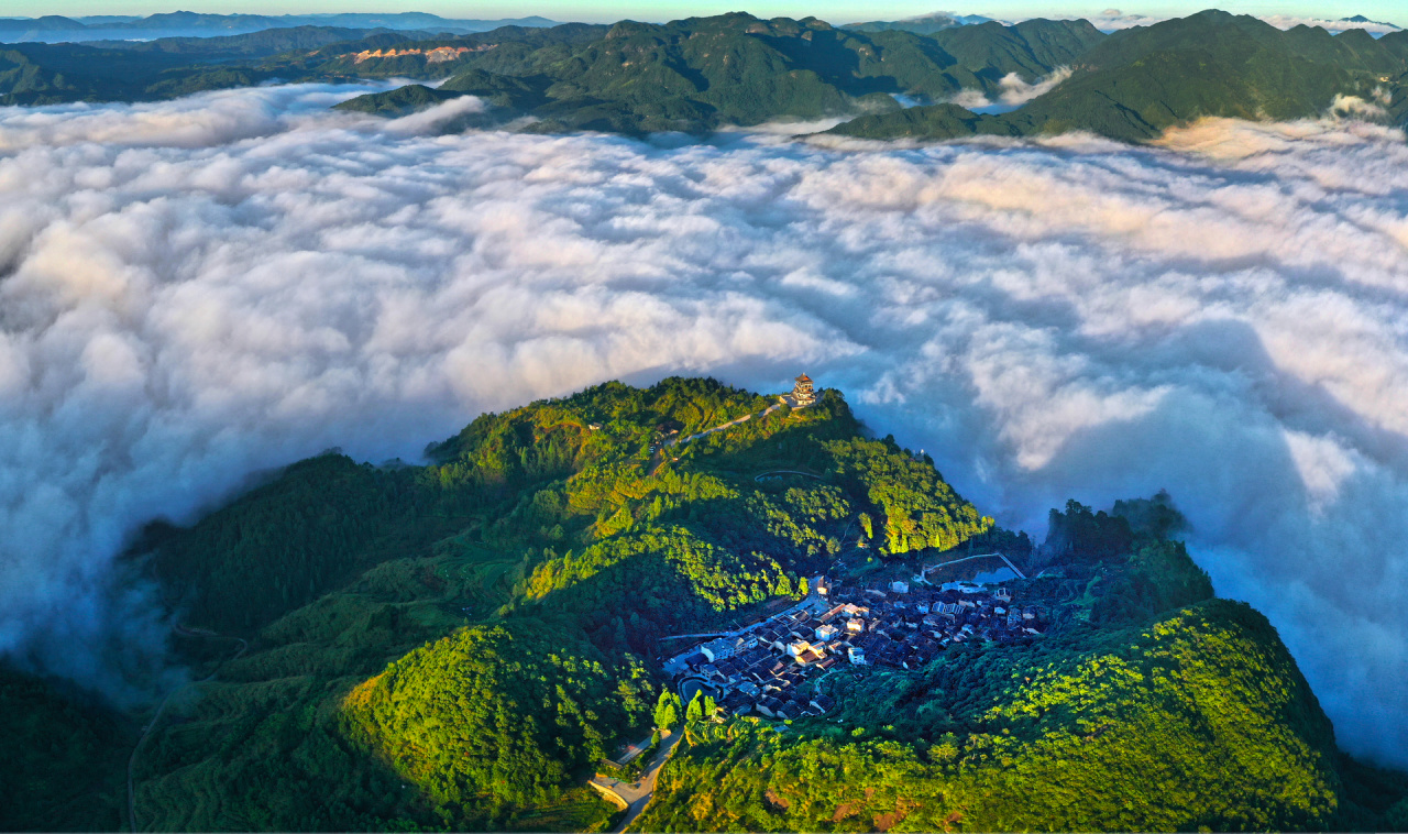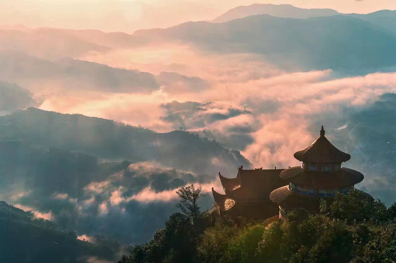 最為神奇的是“云海奇觀”。群山籠罩在云海之中,古龍寺若隱若現(xiàn)。
