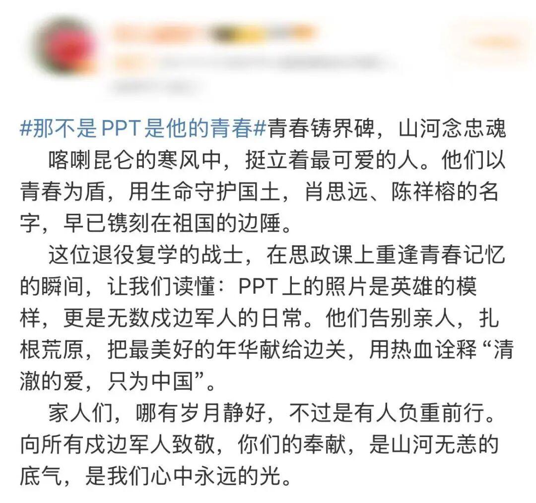 (原標(biāo)題:戍邊戰(zhàn)士回到課堂,課件是他的經(jīng)歷!網(wǎng)友:那不是PPT,那是他的青春)